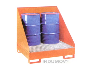 Batea antiderrame construida en chapa plegada Nº 14, conformando una batea estanca cuyas dimesiones son de 1380×1380 mm con una altura útil de 280 mm Sobre la misma se ubica un panel cosntruido en hierro angular y metal desplegado pesado, esta pieza es removible, apta para apoyar los 4 tambores de 205 Lts.Debajo de esta batea se ubican 4 estribos construidos en hierro planchuela de 2”x1/4” Con el proposito de mover el conjunto de batea con autoelevador Acabado en esmalte sintético de color azul (RAL-5012)