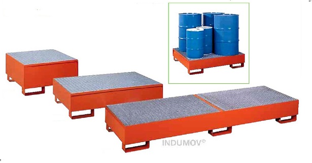 Batea antiderrame construida en chapa plegada Nº 14, conformando una batea estanca cuyas dimesiones son de 1380×780 mm con una altura útil de 280 mm Sobre la misma se ubica un panel construido en hierro angular y metal desplegado pesado, esta pieza es removible, apta para apoyar los 2 tambores de 205 Lts.Debajo de esta batea se ubican 4 estribos construidos en hierro planchuela de 2”x1/4” Con el proposito de mover el conjunto de batea con autoelevador cabado en esmalte epoxi de color azul (RAL-5012)