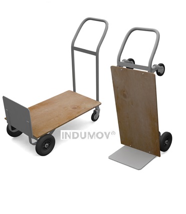 Carretilla Convertible de dos funciones que se amalgaman en un solo modelo Este puede ser utilizado como una carretilla normal para luego y a través de tres pasos simples, se transforma en una practica zorra de carga Con dos ruedas neumáticas de diámetro 250 mm y dos ruedas giratorias en PVC de diámetro 125 mm Capacidad de carga de 250 Kg. Las dimensiones de su pala en chapa de 1/8 » de espesor son de 400 x 300 mm, su altura es de 1.200 mm Posee una base en multilaminado fenolico de 420×960 mm