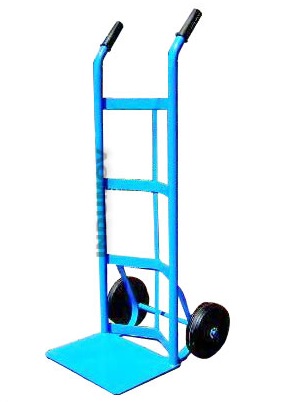 Carretilla reforzada con puños y de respaldo curvo, fabricada para una capacidad de carga de 210 Kg Las dimensiones de su pala en chapa de 1/8 » de espesor son de 400×300 mm, su altura es de 1.200 mm Con dos ruedas en PVC reforzadas de diámetro 200 mm Ideal para el acarreo de latas de pinturas, thinner, cilindros, etc Acabado en esmalte epoxi de color azul (RAL-5012)