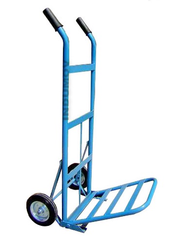 Carretilla con puños y de pala rebatible de 400×600 mm de profundidad, constuida en caño estructural, con dos ruedas de diámetro 200 mm en chapa y goma Capacidad de carga 160 kg Acabado en esmalte epoxi de color azul (RAL-5012)