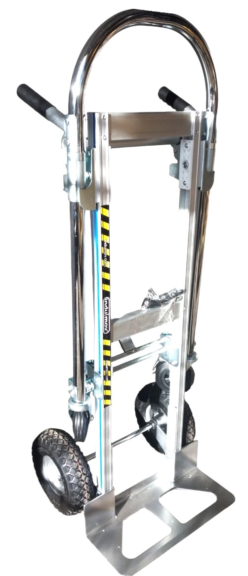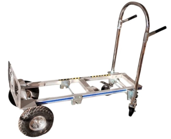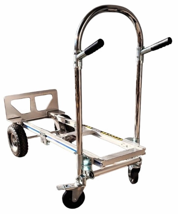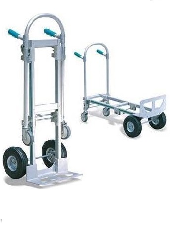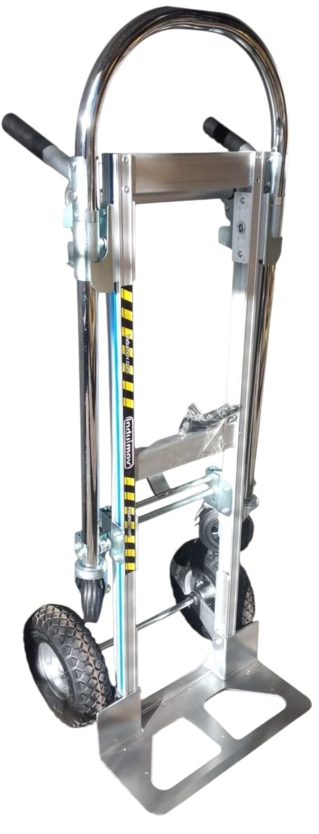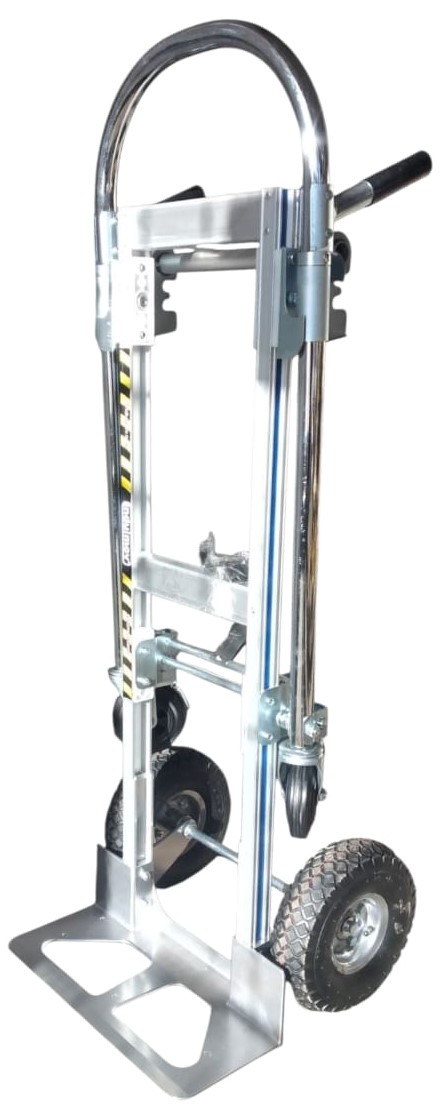 Carretilla Convertible de ALUMINIO, súper reforzada de empuñadura cerrada, fabricada en aluminio estruido de alta resistencia, su base está construida en fundicion nodular de aluminio de alto impacto Su practicidad recide en tener dos equipos en uno, en la posicion de carretilla de dos ruedas la misma tiene una capacidad de carga de 230 Kg Mediante un simple proceso de armado la misma se transforma en una practica zorra manual de carga de 4 ruedas, donde se le suman dos bases giratrorias con ruedas de diametro 125 mm para una capacidad de carga de 140/230 Kg