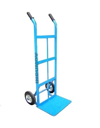 Carretilla Porta Cajas reforzada con puños, fabricada para una capacidad de carga de 240 Kg. las dimensiones de su pala en chapa de 1/8 » de espesor son de 400×300 mm, su altura es de 1.200 mm Con dos ruedas en PVC reforzadas de diámetro 200 mm en PPL/PVC Acabado en esmalte epoxi de color azul (RAL-5012)