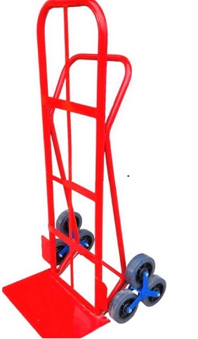 Carretilla Sube Escaleras reforzada de empuñadura cerrada, con dicha empuñadura nos permite tirar del carro hacia arriba, fabricada para una capacidad de carga de 210 Kg, las dimensiones de su pala en chapa de 1/8 » de espesor son de 400 x 500 mm, su altura es de 1.300 mm Con dispositivo trepador, consistente en dos juegos de tres ruedas cada uno para ir trepando escalón por escalón Ruedas en PPL/PVC de 150mm con rodamientos Acabado en esmalte epoxi de color rojo bermellon