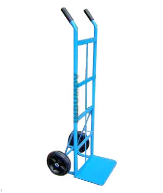Carretilla reforzada con puños, fabricada para una capacidad de carga de 240 Kg. las dimensiones de su base en chapa de 1/8 » de espesor son de 400 x 300 mm, su altura es de 1.200 mm Con dos ruedas en PVC reforzadas de diámetro 200 mm Acabado en esmalte epoxi de color azul (RAL-5012)