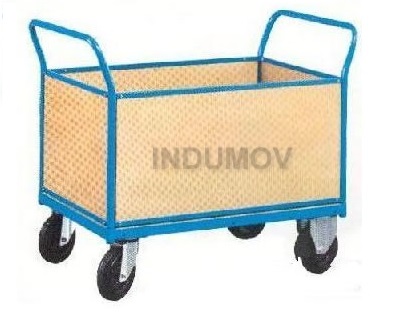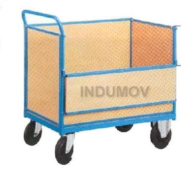 Este carro está cerradocon multilaminado fenolico/fibrofacil de 10 mm de espesor cuya altura útil es de 600 mm. De construcción robusta, el piso como sus laterales cerrado en multilaminado fenolico Su lateral posee una media baranda volcable para permitir el acceso a la carga. De cuatro ruedas en chapa y goma con rodamientos, dos giratorias con freno y dos fijas de 125/160 mm de diámetro Capacidad de carga 450 Kg Acabado en esmalte epoxi de color azul (RAL-5012)