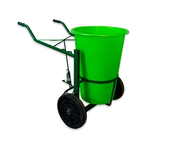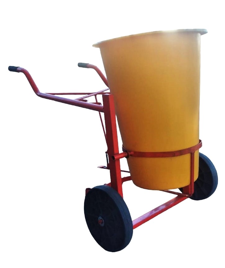 Carretilla para Barrido Publico, Constuido en caño estructural Acabado en pintura epoxi Con ruedas de goma maciza de 360mm de diámetro Con pedal para el vaciado de su vasija construida en PVC mediante rotomoldeo resistente al maltrato y con protección UV Sus dimensiones Diámetro mayor 570mm Diámetro menor 350mm Altura 750mm Capacidad de carga: 120Kg