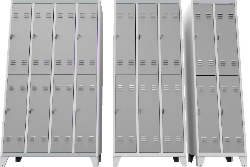 MODELO: GPC-8P Guardarropas De 8 puertas cortas (1.900×1.050×500 mm), MATERIAL Chapa 24 de Acero D.D. reforzada laminada en frío calibre 0,56 mm, CIERRE Para Candado, ACABADO Pintura Epoxi liquido horneable, PUERTAS La medida de la puerta de 250 mm x 820 mm, contiene rejilla de ventilación y dos bisagras por puertas, PATAS SANITARIAS calibre 1,20 mm. (Chapa 18) COLOR ESTANDAR (beige, marrón, gris claro, gris oscuro y azul),