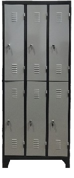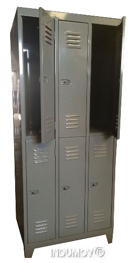 MODELO: GPC-6P Guardarropas De 6 puertas cortas (1.900x780x520 mm), MATERIAL Chapa 24 de Acero D.D. reforzada laminada en frío calibre 0,56 mm, (CIERRE CON CERRADURA INDIVIDUAL), ACABADO Pintura Epoxi liquido horneable, PUERTAS La medida de la puerta de 250 mm x 820 mm, contiene rejilla de ventilación y dos bisagras por puertas, PATAS SANITARIAS calibre 1,20 mm. (Chapa 18) COLOR ESTANDAR (beige, marrón, gris claro, gris oscuro y azul),