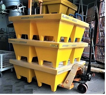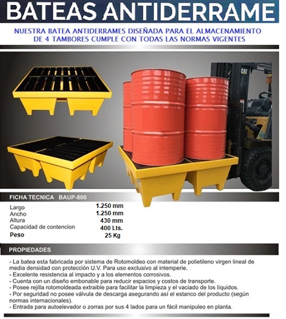 Nuestra batea antiderrames está diseñada para cumplir con las normas para el almacenamiento de 4 tambores de 200L o bien 32 bidones de 20L Cuenta con una serie de ventajas: Su rejilla es extraíble facilitando su vaciado o limpieza Las múltiples barras de refuerzo ubicadas en la superficie de contención distribuye mejor el peso de la carga evitando roturas El diseño de la misma hace que el líquido derramado sea redireccionado hacia su parte interior La batea no cuenta con válvula de descarga, ya que está podría quedar abierta o bien fallar; asegurando así la estanqueidad total Con este requisito estas bateas INDUMOV cumplen con las normas internacionales al respecto Su diseño embonable reduce el espacio y costo de transporte Dispone de entradas para las uñas de un altoelevador para facilitan su traslado Presentacion en color amarillo medio (RAL 5012)