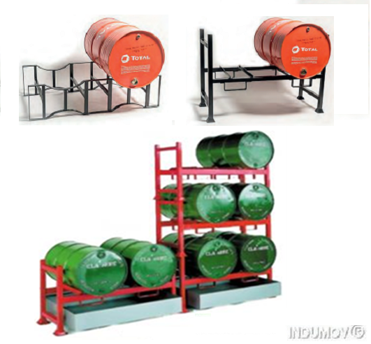 Soporte Estibable para dos tambores del tipo comercial de 205 Lts. Estos soportes son apilables entre si, conformando estanterias para almacenaje Su aplicación está indicada tanto para el interior como para el exterior de plantas industriales Acabado en esmalte epoxi de color azul (RAL-5012) Acabado en esmalte epoxi color gris RAL 5016