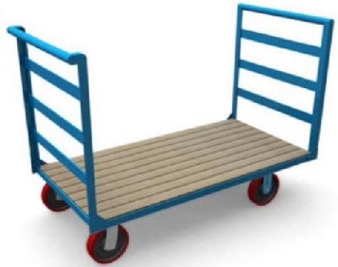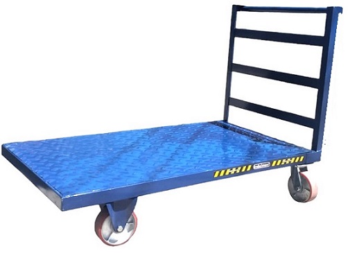 Esta zorra manual para cargas pesadas, preparada para una capacidad de carga de 800 Kg, se fabrica con piso de chapa rayada N°16. Su bastidor contruido en caño estructural de 50x30x1,6 Posee una baranda de empuje de construcción angular, cerrada con planchuelas de 2″x 3/16″ De cuatro ruedas en fundición y goma, fundición y poliuretano o nylon, de diámetro 160 / 200 mm con rodamientos, dos giratorias y dos fijas Acabado en esmalte epoxi de color azul (RAL-5012)