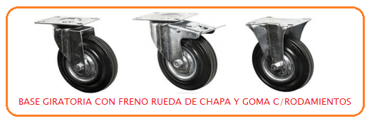 Con cuatro ruedas en chapa y goma o nylon, de diámetro 160 mm con rodamientos, dos giratorias y dos fijas Acabado en esmalte epoxi de color azul (RAL-5012)